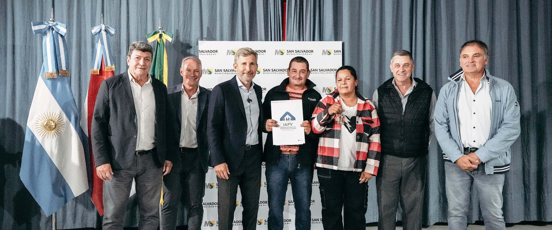 Durante su visita a San Salvador, Frigerio fue acompañado por el ministro de Planeamiento, Infraestructura y Servicios, Darío Schneider, y los presidentes del Instituto Autárquico de Planeamiento y Vivienda (IAPV), Manuel Schönhals, y del Consejo General de Educación (CGE), Alicia Fregonese. También estuvieron presentes los vocales del organismo Luis Uriona, Aníbal Steren y José Artusi y el director de la Regional Salto Grande, Alfonso Sá. Entregó 54 escrituras correspondientes a los barrios San Salvador 24 Viviendas, San Salvador 15 Viviendas, San Salvador 32 Viviendas, San Salvador 40 Viviendas, San Salvador 53 Viviendas y San Salvador 25 Viviendas.